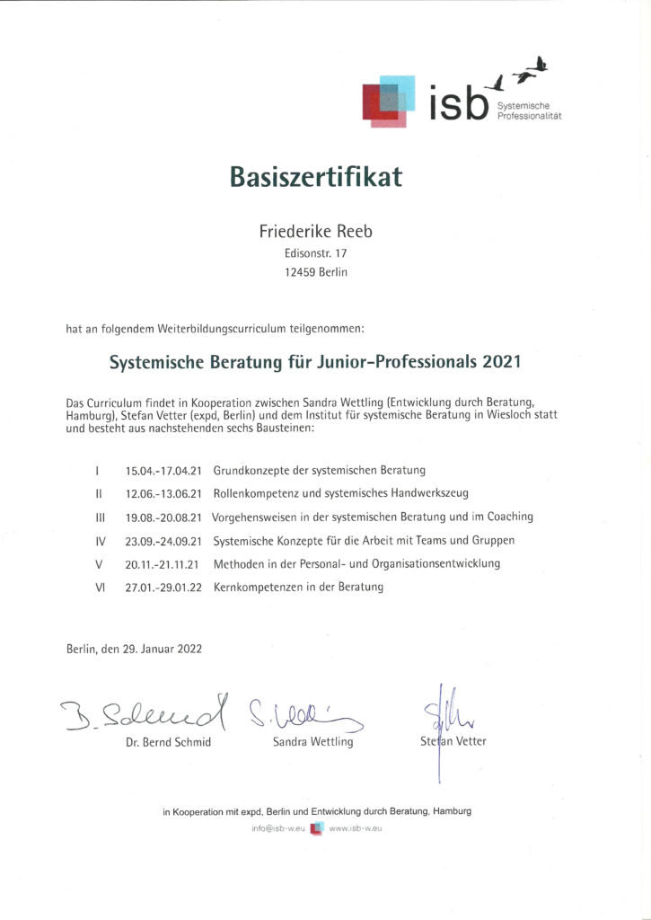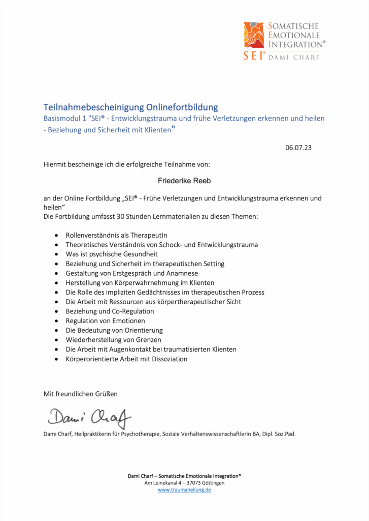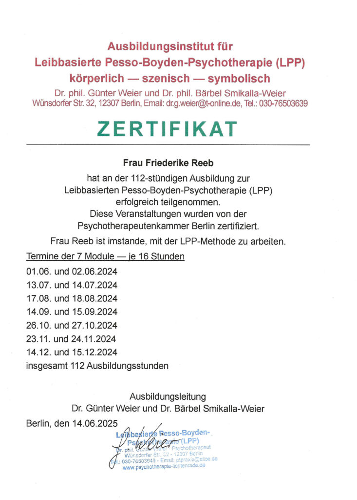 Heute bin ich zertifizierte systemische Beraterin (ISB Wiesloch), habe eine Weiterbildung in körperorientierter Traumabegleitung nach Dami Charf (SEI) und eine Ausbildung in Leibbasierter-Pesso-Boyden-Therapie abgeschlossen (zertifiziert von der Psychotherapeutischen Praxis Berlin-Lichtenrade).